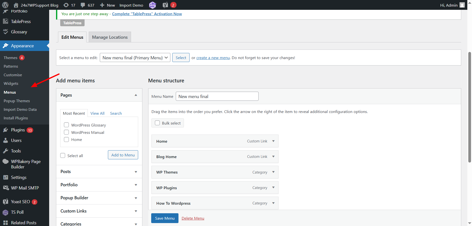 Go to Appearance → Menus in your dashboard. From here, you can add pages, posts, custom links, and blog categories. Assign the menu to different locations like the header, footer, or sidebar.